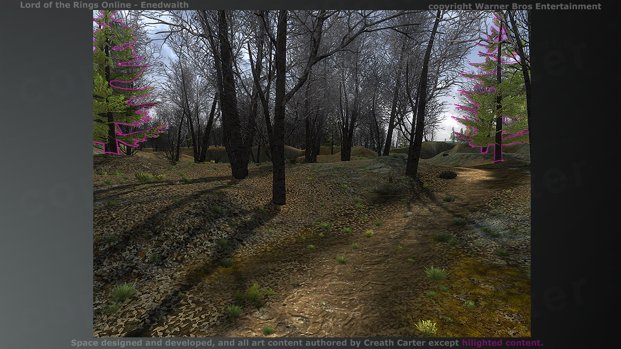 I helped concept Enedwaiths geography and biomes, created the majority of the terrain textures, and environment art assets such as trees, rocks, and other natural features. I did not create characters, structures, or architectural elements.